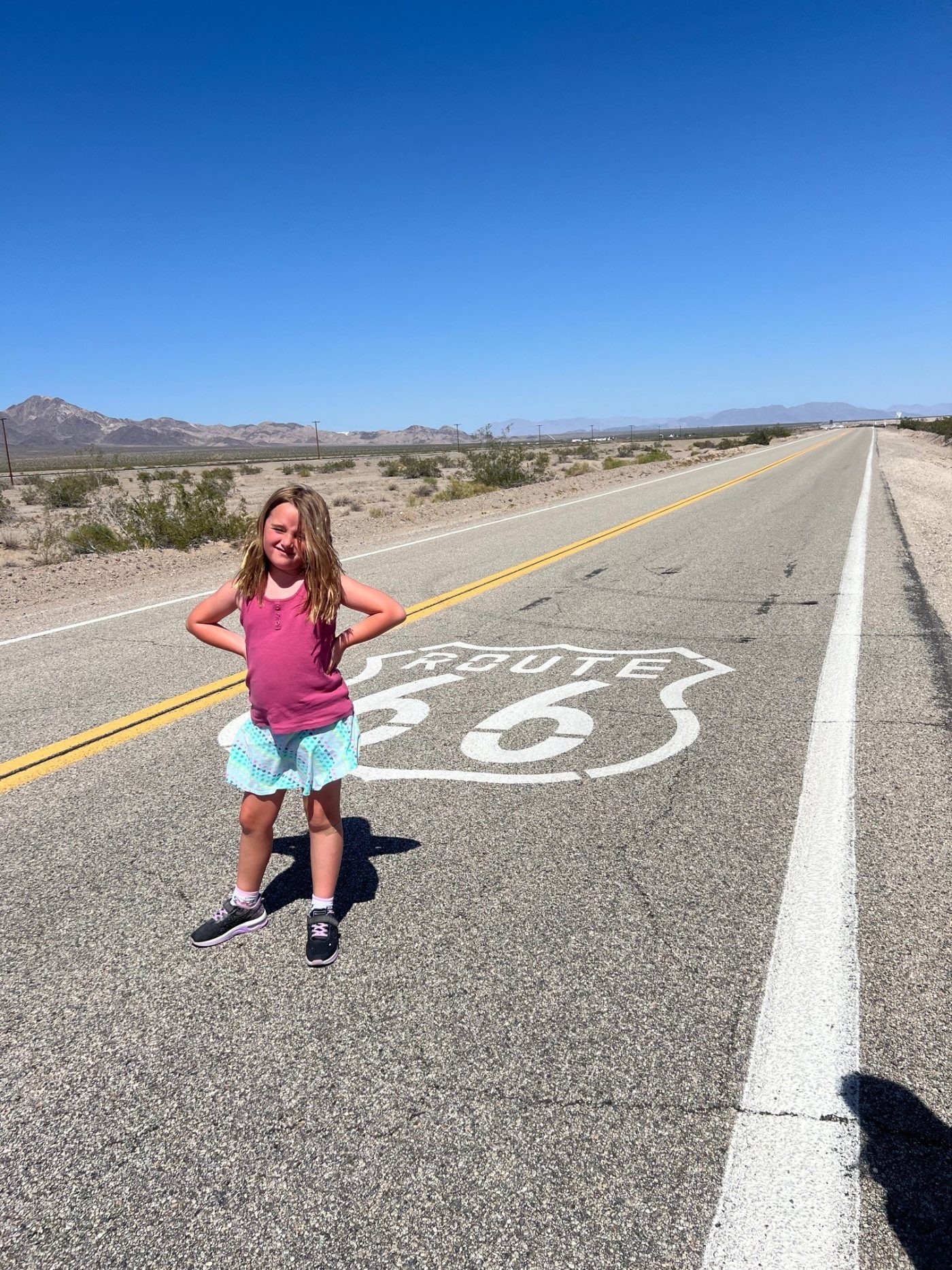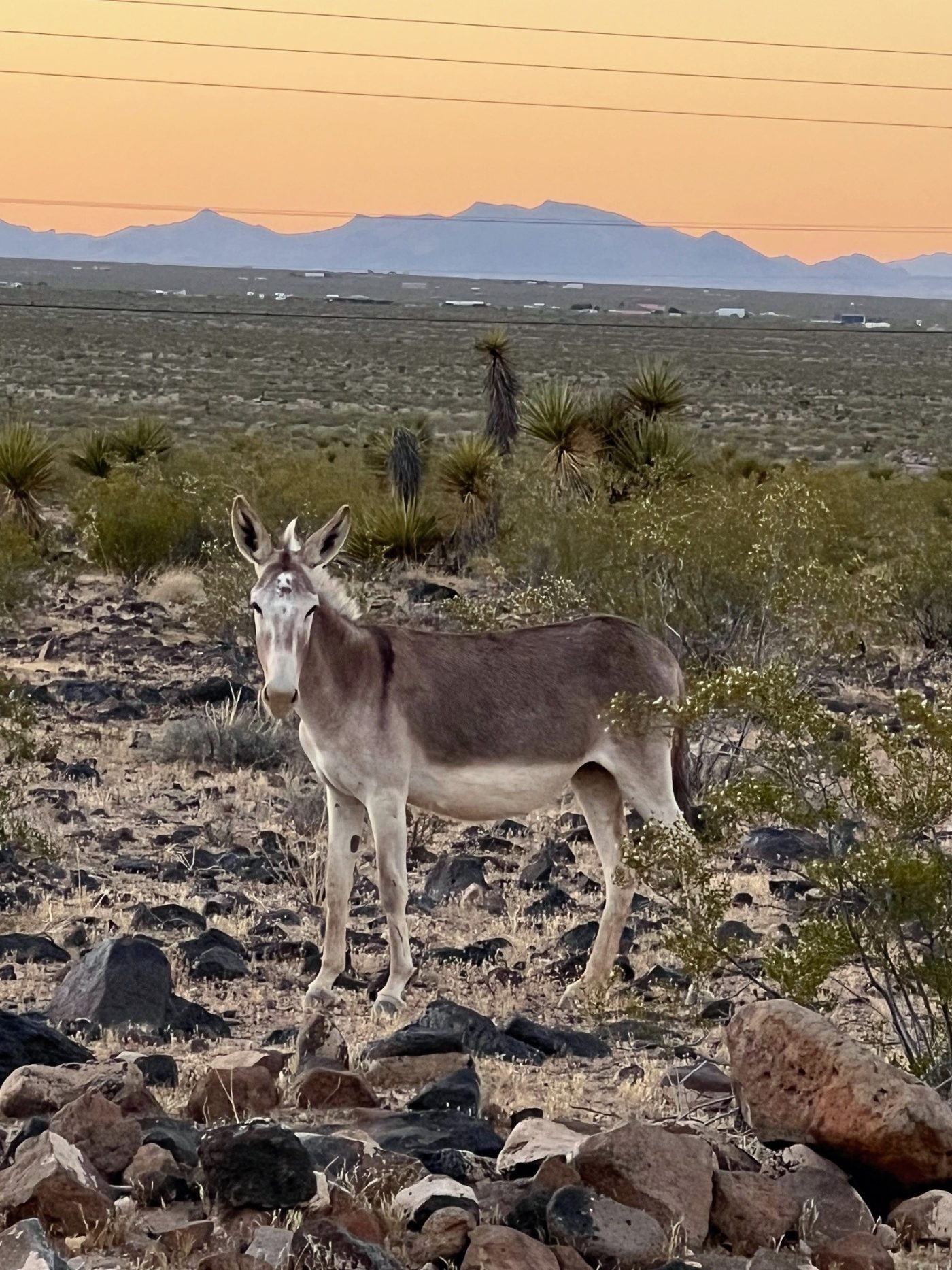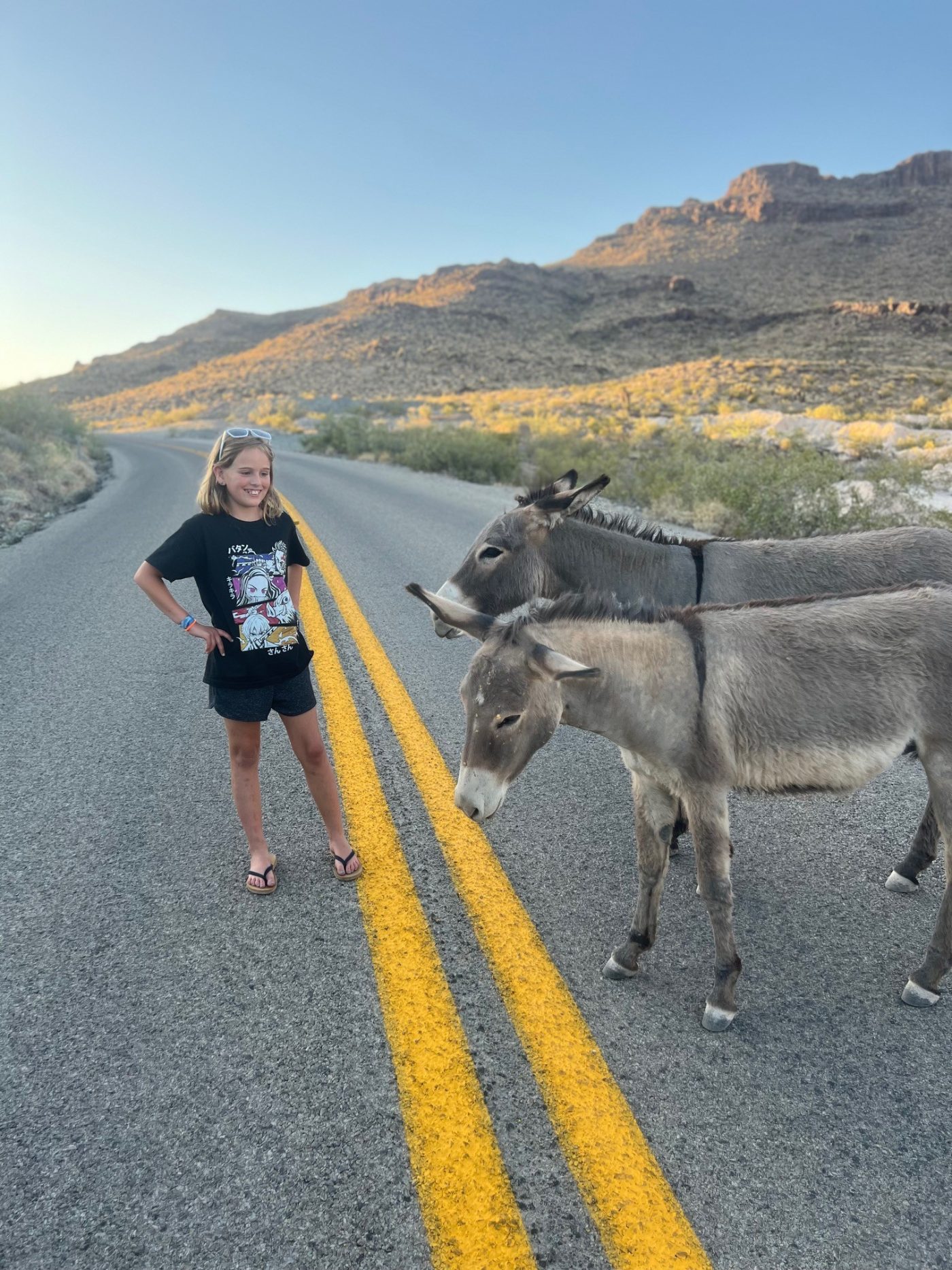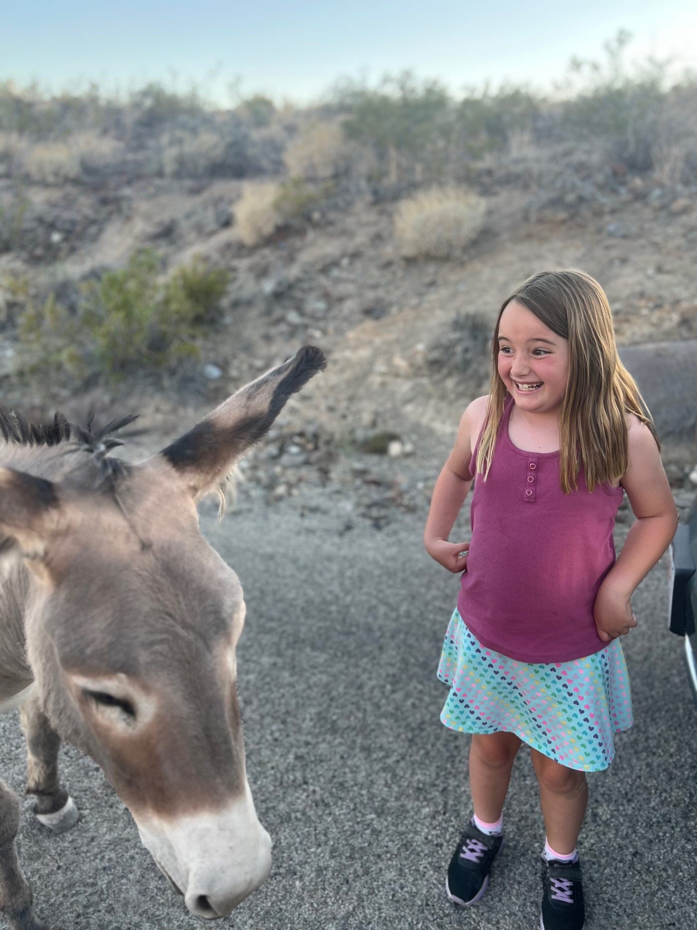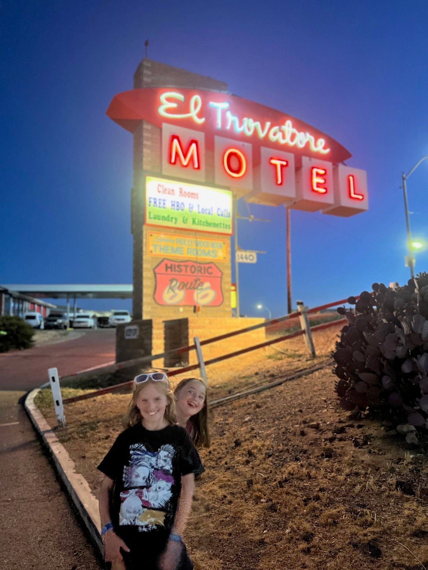 For Route 66 enthusiasts, favorite stops this week included Joshua Tree National Park, Amboy Crater, some big hills and dips in the road in the high desert that thrilled Olivia and Amelia, an especially cheerful server named Kim at the Wagon Wheel restaurant in Needles, CA, feeding hay to the over a dozen wild burros we encountered in the middle of the road (one tried to eat Allison’s purse!), and arriving at dusk to the neon sign of El Trovatore Motel in Kingman, AZ.